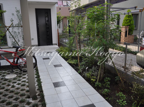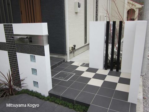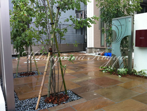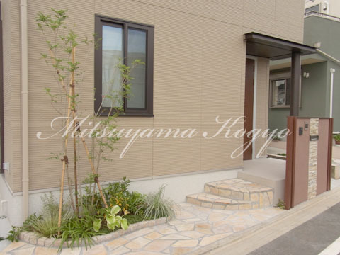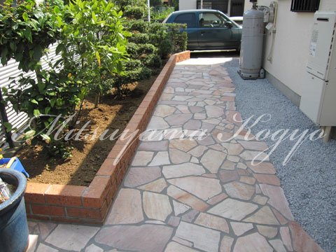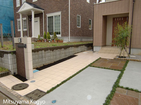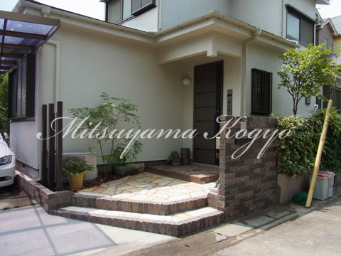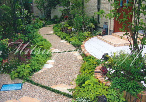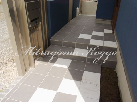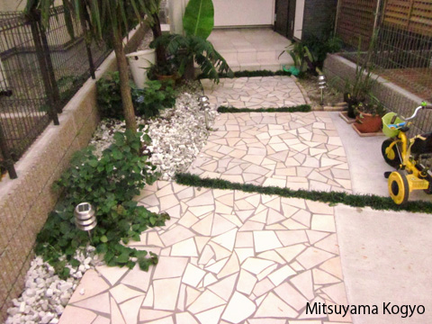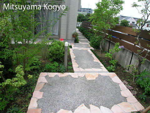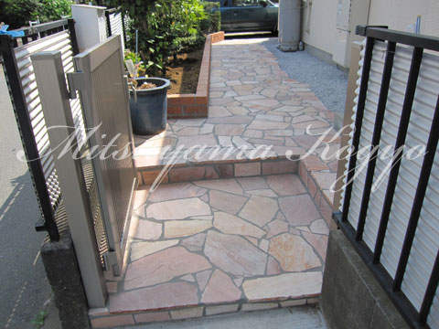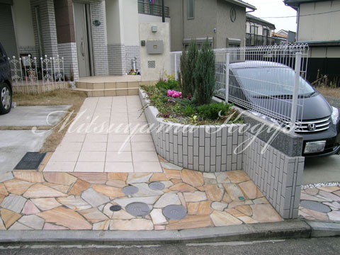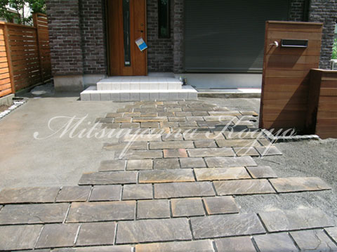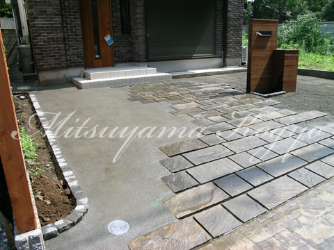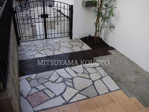 自然石やインターロッキング、タイル、洗い出し・・・多彩な表情や色彩、並べ方や貼り方が楽しめる施工例です。